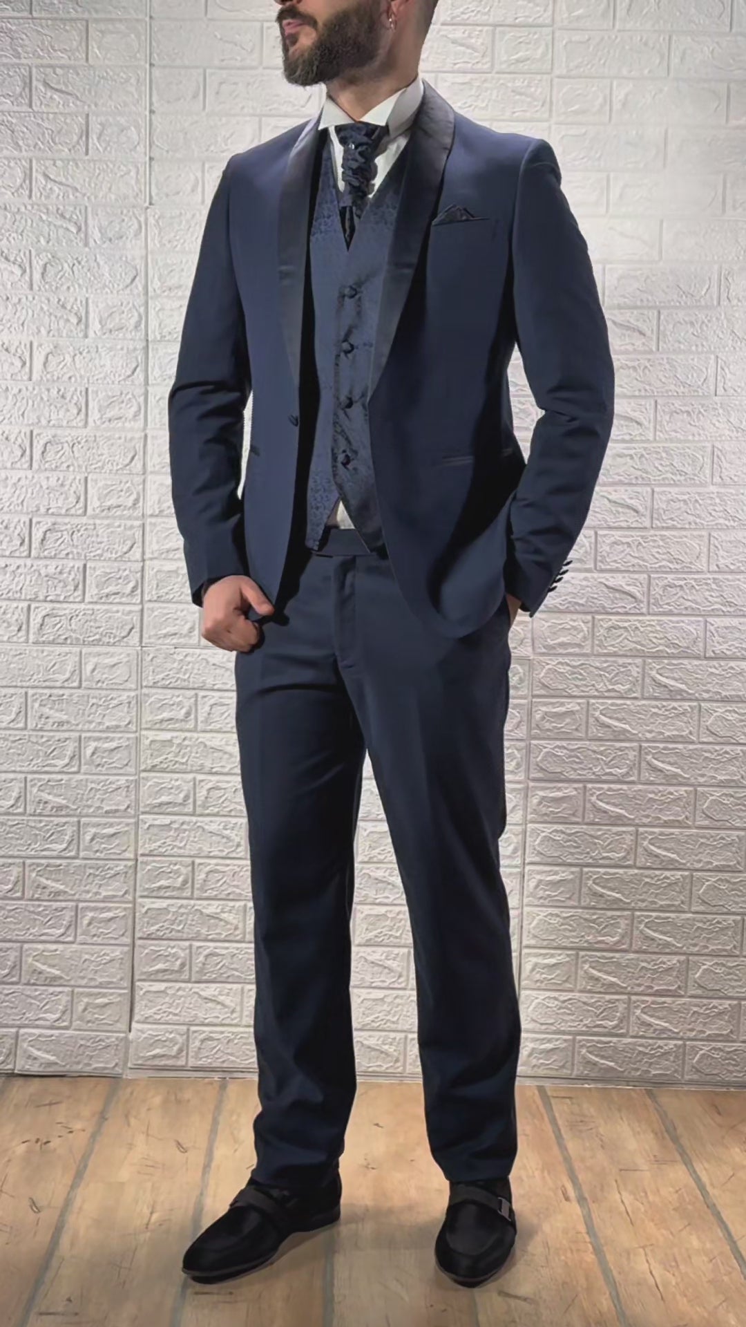 Abito completo smoking composto da giacca e pantalone con taglio slim. La giacca ha la chiusura frontale con un bottone ed il petto blu lucido tinta su tinta. Nel prezzo, avrete anche abbinato il gilet, il cravattone ed il fazzoletto come presenti in foto.
