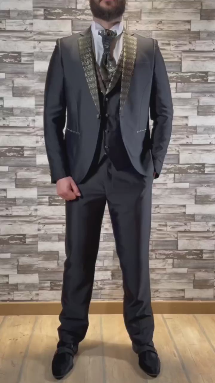 Esclusivo abito completo nero e oro con giacca, pantalone, gilet e cravattone in tessuto lucido. Vestibilità slim che esalta la silhouette maschile, per un look di lusso e raffinato. Perfetto per occasioni speciali e serate eleganti. Aggiungi un tocco sofisticato al tuo stile con questo abito unico.