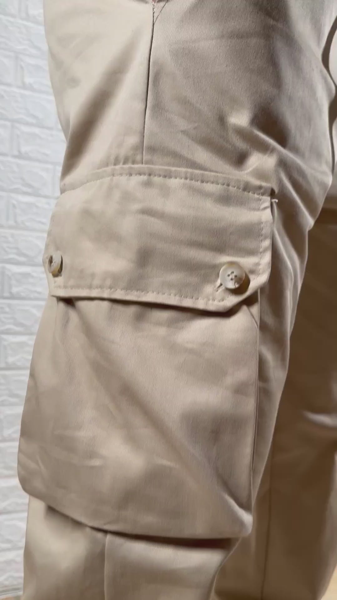Pantalaccio cargo in cotone,leggero e primaverile. Presenti tasconi laterali con bottoni, elastico in vita con relativi laccio, e polsini alle caviglie. Vestibilità oversize quindi comoda, il modello in foto è alto 183 cm, pesa 80 kg ed indossa una taglia M.