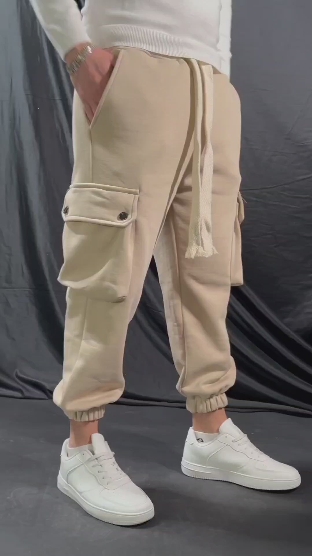 Pantalaccio tuta in cotone felpato modello cargo, con tasche laterali. Vestibilita oversize, cioè piu comodo sulle gambe. Presenti sia bottoni sulle tasche laterali, sia polsini elastici alle caviglie.