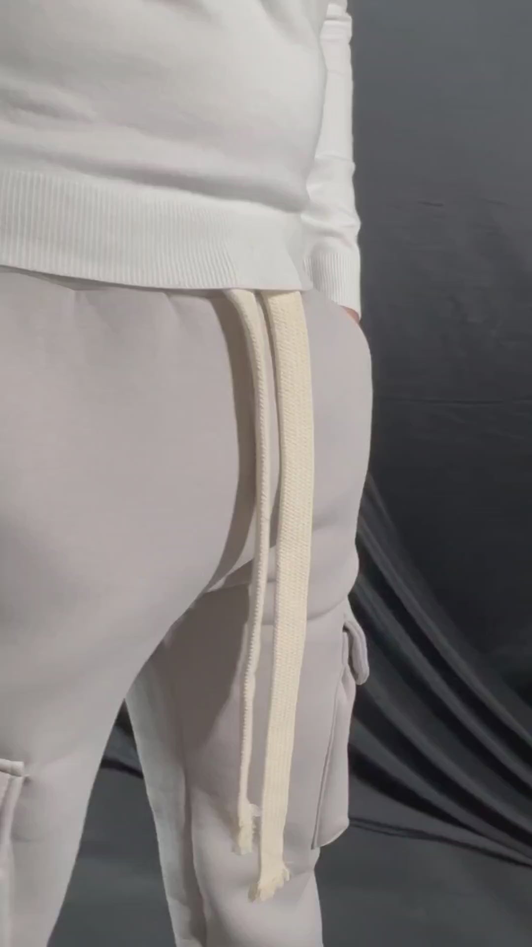 Pantalaccio tuta in cotone felpato modello cargo, con tasche laterali. Vestibilita oversize, cioè piu comodo sulle gambe. Presenti sia bottoni sulle tasche laterali, sia polsini elastici alle caviglie.