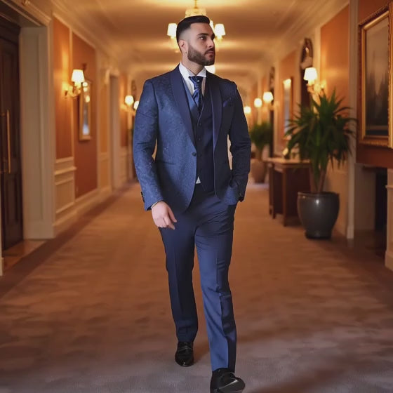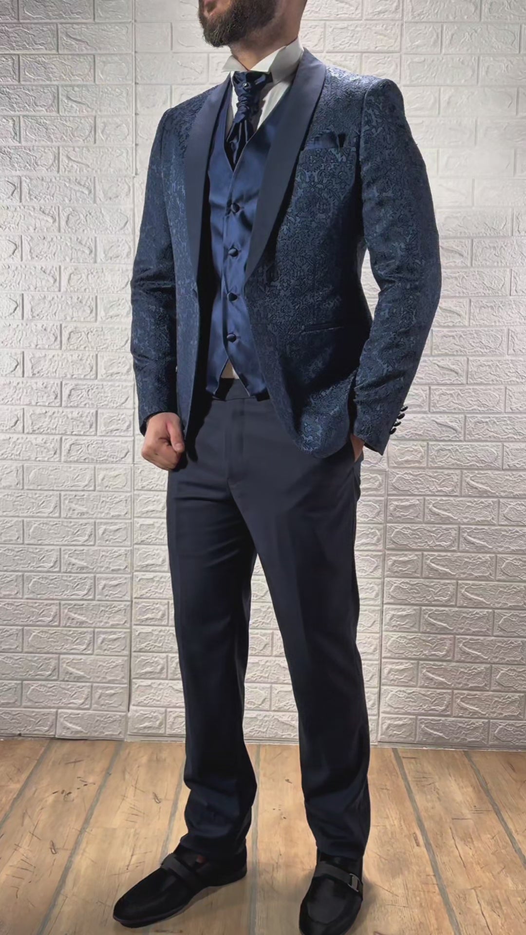 Abito completo elegante con gilet e cravattone art smoking damascato blu